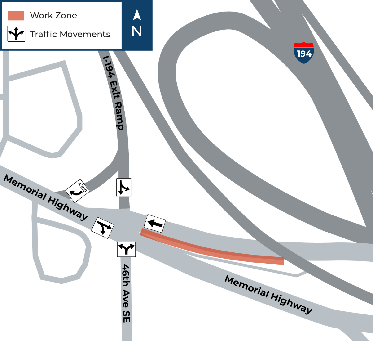 Next week, crews will begin concrete repair on 46th Avenue Southeast just south of the intersection. During that phase, northbound traffic on 46th Avenue Southeast will be limited to right turns only onto Memorial Highway. Traffic on 46th Avenue Southeast will not be able to turn west onto Memorial Highway.